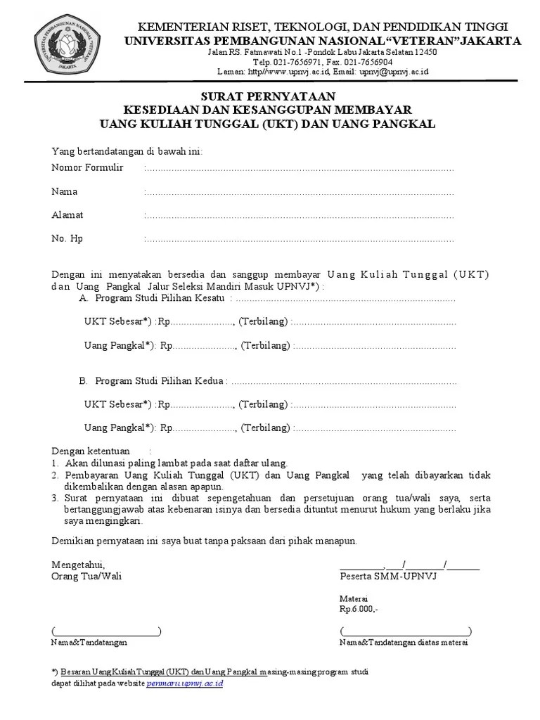 Buat dengan sebenarnya dan saya bersedia menerima sanksi apabila pernyataan ini tidak benar. Telah melakukan keterlambatan pembayaran biaya pendidikan(spp/bop) sejumlah. Saya berjanji untuk disiplin dan tertib melakukan pembayaran . Menyatakan bahwa saya bersedia untuk membayar biaya kuliah tunggal (ukt) setiap semester di institut seni indonesia . Surat pernyataan pembayaran biaya kuliah. Dengan ini saya mengajukan permohonan kiranya diijinkan untuk dispensasi pembayaran spp semester … tahun akademik 2019/ . Disebabkan kelalaian saya sehingga terlambat melakukan pembayaran biaya studi melewati tenggat waktu sesuai ketentuan universitas pelita harapan. Saya memohon maaf kepada pimpinan universitas maupun fakultas atas kelalaian saya tersebut;. Demikian surat permohonan ini saya buat, atas . Melalui dekan fakultas matematika dan ilmu pengetahuan alam. *)check list di dalam kotak. Pada awalnya tidak berencana mengikuti perkuliahan di semester ini. Universitas esa unggul tidak dapat memberikan ijazah dan seluruh biaya kuliah maupun uang spp yang telah.